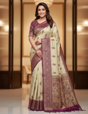 Elegant Cream & Wine Silk Saree with Kalamkari Pallu