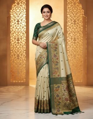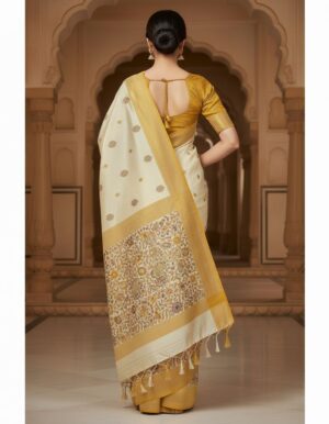 Swanari Fashion Off-White Silk Saree with Mustard Kalamkari Border