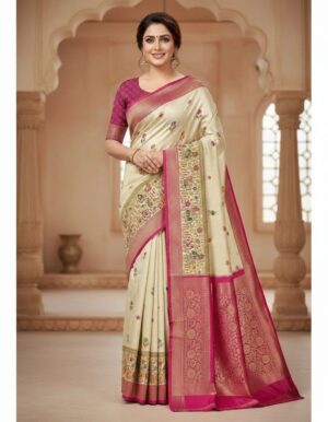 Swanari Fashion Cream Silk Saree with Rani Pink Kalamkari Border