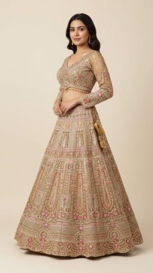 This exquisite Golden Beige Lehenga Choli is a masterpiece of traditional Indian embroidery. The luxurious long-sleeved choli and voluminous skirt are completely covered in dense, shimmering Gold Zari, Sequin, and Bead Work. The opulent gold base is elegantly accentuated with delicate Soft Pink Thread used to outline intricate paisley and floral motifs, adding a feminine…