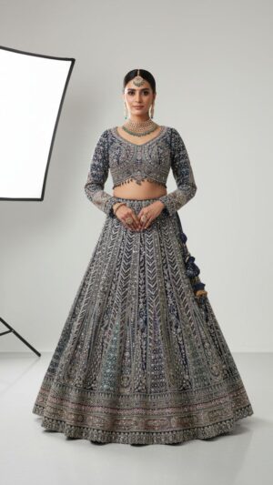 This dazzling Navy Blue Lehenga Choli is designed for the spotlight, offering sophisticated depth and spectacular sparkle. The entire ensemble, in a rich dark blue hue, is lavishly adorned with dense, intricate work using both Gold and Silver Sequins and Beads. The voluminous skirt features a spectacular textured pattern, while the sleeveless choli is fully…