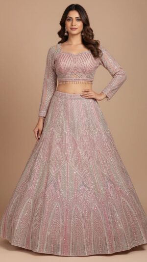 This exquisite Dusty Pink Lehenga Choli is a perfect choice for the modern, glamorous event. The entire ensemble, from the full-sleeved choli to the voluminous skirt, is lavishly covered in a dense layer of Self-Color and Silver Sequins. The ornamentation is distinguished by a contemporary Geometric or Chevron Pattern that runs vertically, offering a visually…