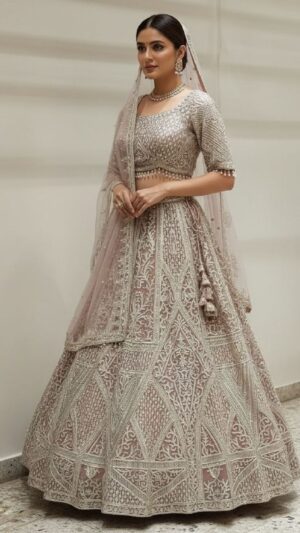 This gorgeous Dusty Mauve Lehenga Choli is a perfect blend of modern style and rich embellishment. The half-sleeved choli is richly covered in intricate Self-Color and Silver Bead and Sequin Work. The voluminous net skirt, in a beautiful purplish-pink hue, features a distinctive knife-pleated texture and is delicately sprinkled with pearls or sequins across the…