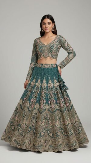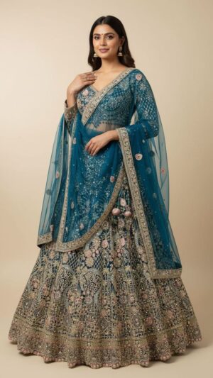 This truly magnificent Golden Beige Lehenga Choli is a masterpiece of traditional Indian artistry. The half-sleeved choli and voluminous skirt are completely blanketed in dense, shimmering Gold and Silver Zari, Sequin, and Bead Work. The embroidery is distinguished by beautiful, large Peacock Motifs and detailed geometric panels on the skirt, cleverly accented with rich Teal/Dark…