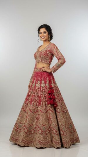This magnificent Red Lehenga Choli is the epitome of traditional Indian bridal wear, showcasing spectacular craftsmanship. The voluminous skirt, in a rich, deep red hue, is entirely blanketed in dense, shimmering Gold Zari, Sequin, and Bead Work. The embroidery features traditional paisley and floral motifs, creating a highly textured and opulent fabric. The full-sleeved choli…