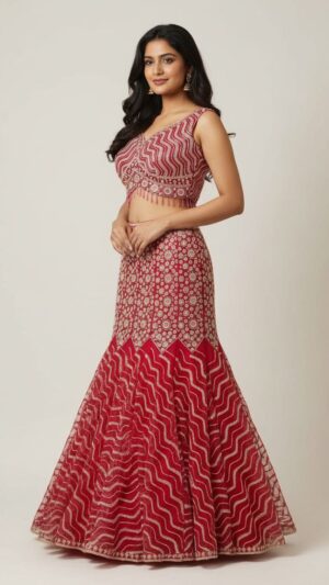 Step into the spotlight with this enchanting Maroon Net Lehenga Choli. The outfit features a dreamy, voluminous skirt crafted from soft net fabric, elegantly scattered with sparkling silver sequins and stones that catch the light with every movement. The sophisticated sleeveless choli perfectly complements the look, showcasing rich silver or white thread embroidery and intricate…