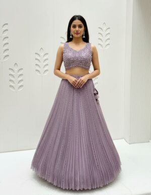 This chic Dusty Green Lehenga Choli is a perfect choice for a modern, sophisticated event. The long-sleeved choli is the artistic focal point, boasting intricate, heavy Silver Zari, Sequin, and Contrast Pastel Pink Threadwork in an elaborate bodice pattern. This detailed top is paired with a voluminous net skirt in a soft, dusty green hue….