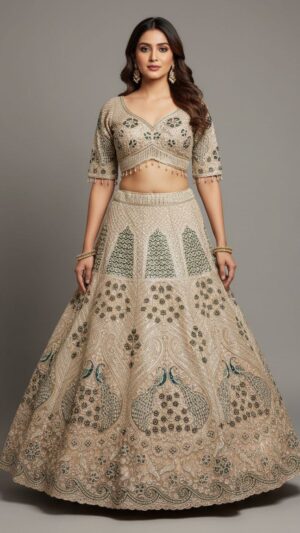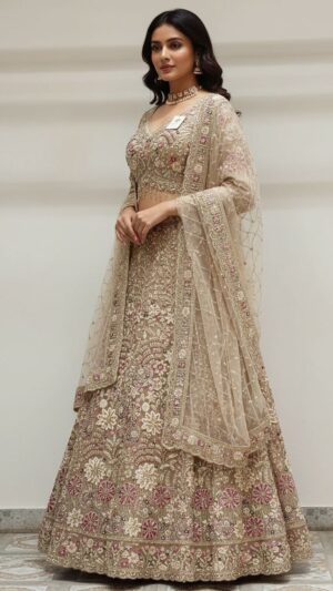 This breathtaking Golden Beige Lehenga Choli is a garment of supreme luxury and fine detail. The long-sleeved choli and voluminous skirt are completely blanketed in a rich tapestry of dense, shimmering Gold Zari, Sequin, and Bead Work. The opulent embroidery features intricate Floral and Stylized Motifs, brilliantly highlighted with Pink, Maroon, and Green Threadwork. The…