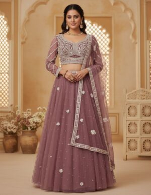 Embrace ethereal beauty with this charming Baby Pink Net Lehenga Choli. The soft, romantic pink hue is perfect for day events and festive evenings. The voluminous net skirt and dupatta feature delicate, scattered white floral embroidery that creates a graceful, flowing look. The highlight is the sophisticated full-sleeved choli, which is richly embellished with dense…