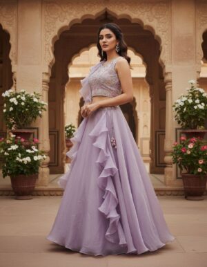 Color is a standout feature here; while traditional pinks and greens are available, the collection shines with modern pastels like lavender, peach, and pista green, as well as sophisticated jewel tones like wine and teal. Many pieces feature unique accents like patch borders and paisley prints, offering a look that is both unique and timeless. Whether you are aiming for a “fairytale” aesthetic or a sleek, high-fashion statement, these lehengas provide a curated selection of “semi-stitched” options to ensure a personalized fit for your big announcement.