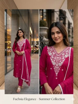 Embrace effortless festive style with this striking Ivory Kurta set, perfectly balanced by a vibrant pop of color. The elegant, straight-cut Kurta features delicate multi-hued embroidery on the neckline, offering a subtle touch of traditional artistry. The outfit is elevated by its gorgeous Rani Pink Dupatta, which boasts a contemporary white abstract leaf pattern and…