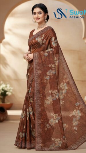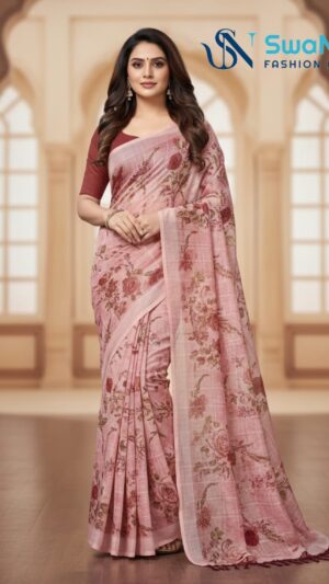 Woven from breathable Premium Linen or a lightweight cotton blend , this soft saree is perfect for comfortable daytime elegance. It features a rich digital floral print in lavender, mauve, and plum tones, creating a natural, artistic aesthetic. The design is subtly framed by a thin woven border in a light shade like grey or…