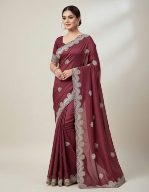 Embrace timeless sophistication with the Elegant Wine Embellished Party Saree. Crafted from a luxurious, smooth Georgette Blend fabric, this saree offers an impeccable, flowing drape and sublime comfort, making it perfect for evening celebrations. The solid Deep Wine/Maroon hue provides a rich, commanding base, complemented by subtle scattered embellishments across the body for a gentle…