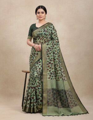This elegant saree features a muted sage green or light moss green color, likely in a textured fabric such as an art silk or cotton-silk blend. The body is adorned with an all-over printed leaf motif in shades of deep maroon, dark red, and black/brown, giving it a rich, autumnal look. The sophisticated border is…