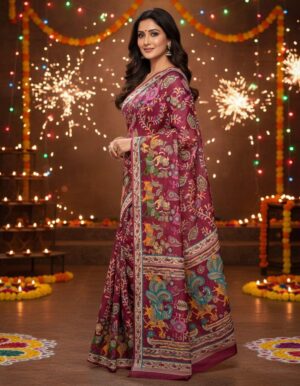 Embrace the deep, enchanting hues of our Wine Kalamkari Saree, a masterpiece that celebrates the heritage of Indian textile art. This saree is meticulously crafted from a premium silk blend, offering a lightweight drape with a luxurious, subtle sheen. The rich wine-colored canvas is brought to life with vibrant Kalamkari prints, featuring iconic peacock motifs…