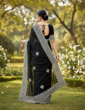 This eye-catching saree boasts a vibrant, deep shades of blue color palette with a striking, abstract tie-dye or shaded effect throughout the fabric, likely a georgette or lightweight art silk. The dynamic coloring gives the illusion of movement. The edge of the saree is beautifully highlighted by a contrasting black border heavily embellished with sequin…