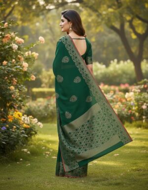 Embrace classic simplicity with this elegant saree, crafted from a smooth, luxurious Georgette or Silk Blend fabric that offers a flattering, soft drape. The striking Deep Emerald Green hue provides a rich, monochromatic look. The design is subtly enhanced by a thin, woven gold and red border that runs along the edges. The distinguishing feature…