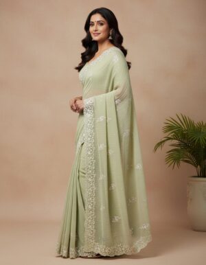 Radiate timeless elegance with this stunning Seafoam Green Saree from the exclusive collection by Swanari Fashion. Crafted from premium, lightweight georgette, this saree offers a fluid drape that beautifully flatters every silhouette while ensuring all-day comfort. The highlight of this exquisite piece is the intricately worked scalloped border, which features delicate floral embroidery in contrasting…