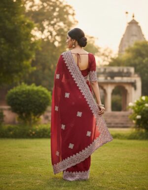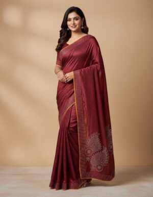 This gorgeous saree exudes opulence with its deep maroon or wine-red color and luxurious sheen, suggesting a material like silk blend or satin. The entire body is scattered with fine dot-like stone embellishments, adding subtle sparkle. The look is elevated by a prominent paisley motif border on the pallu, rendered in silver or white stones….