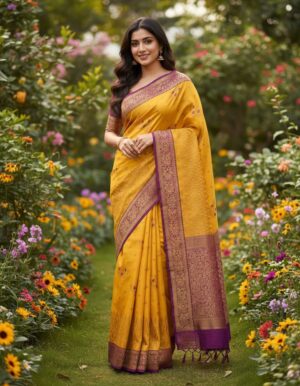 This stunning traditional saree, likely from the Kanjivaram or Banarasi tradition, exudes timeless elegance and vibrant charm. The saree is made from a rich, heavy-quality Silk fabric, giving it a luxurious drape and sheen. The primary Saree Color is a radiant Mustard Yellow or Deep Haldi Yellow, making it instantly eye-catching and festive. The saree…