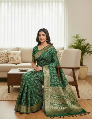 Step into a world of timeless tradition with this stunning Emerald Green Banarasi Silk Saree. A celebration of classic Indian artistry, this ensemble features a rich jewel-toned green hue that exudes luxury and poise. The body is meticulously woven with small gold zari floral butis, while the broad, traditional borders showcase intricate geometric patterns and…