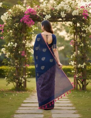 Elevate your evening wardrobe with the “Midnight Sapphire,” a breathtaking Banarasi Silk Saree that epitomizes royal sophistication. The deep, ink-blue body is meticulously woven with delicate gold Zari pin-dots, creating a shimmering effect reminiscent of a star-lit night sky. This celestial pattern provides a refined backdrop for the saree’s true centerpiece: an opulent, wide border…