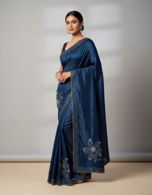 This mesmerizing saree showcases a deep midnight blue color, possibly a satin or silk blend, with a rich, elegant drape. The entire body is adorned with subtle silver or white stone (diamante) work in a scattered dot pattern, adding a luminous shimmer. The striking feature is the elaborate floral motif work done in the same…