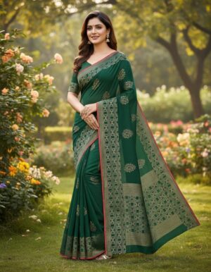 Embrace the grandeur of traditional weaving with the Majestic Teal Kanjivaram Silk Saree. Woven from a high-quality, lustrous Art Silk/Blended Silk, this saree offers a rich, structured drape synonymous with heritage textiles, ensuring you make a regal statement. Adorned in a vibrant Peacock Teal hue, the body is subtly patterned with woven gold butis (motifs)….