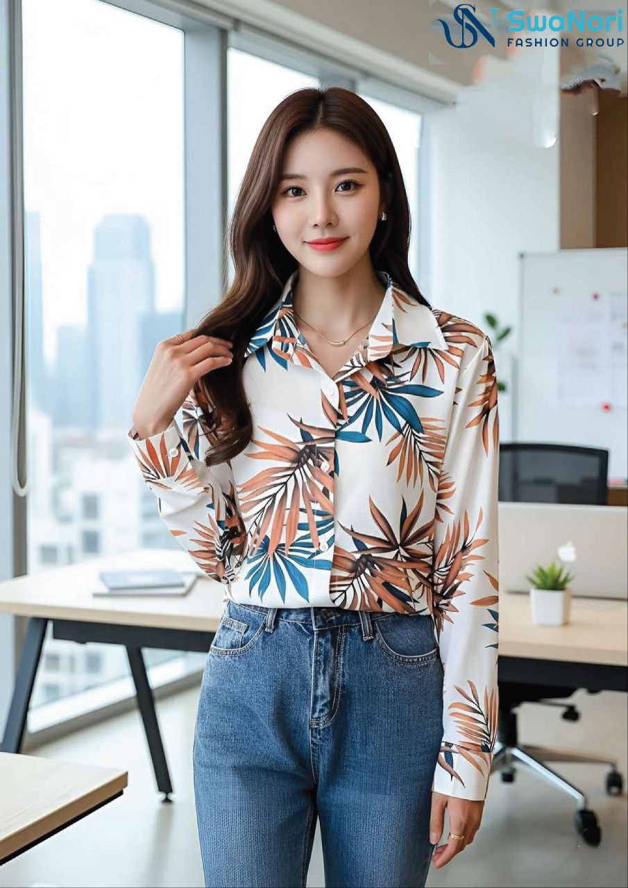 This blouse features a visually appealing long-sleeve design with a tropical leaf and foliage print in warm burnt orange and contrasting deep teal/navy on a white background. It is a button-down shirt with a classic collar, offering a polished and slightly casual aesthetic. The woman is styling it with medium-wash blue denim jeans, worn tucked in for a flattering, high-waisted look, making it a great choice for a stylish weekend or casual Friday office wear.