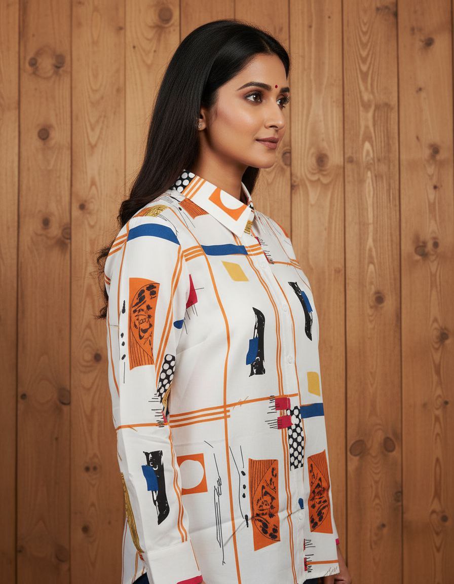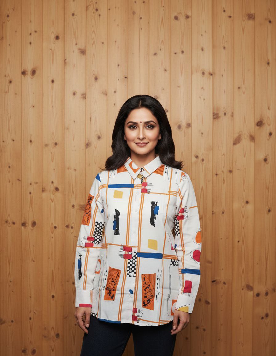 This blouse features a lively, artistic abstract print composed of color blocks and whimsical sketches in white, black, yellow, red, and blue. It is a long-sleeve button-down shirt with a classic collar, creating a structured yet playful look. The woman is styling it casually tucked into medium-wash blue denim jeans for a comfortable and creative everyday ensemble, perfect for a casual office environment or weekend outing.