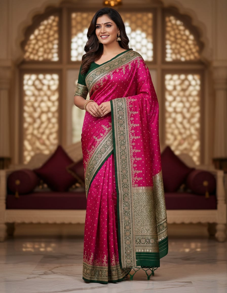 This stunning silk saree embodies a regal, classic aesthetic, often associated with rich traditional weaving techniques like Banarasi or Kanjivaram. The main Saree Color is a striking Deep Red or Rani Pink/Red hue, instantly commanding attention. The fabric is a high-quality, heavy Silk, providing a lustrous finish and a beautiful, structured drape.