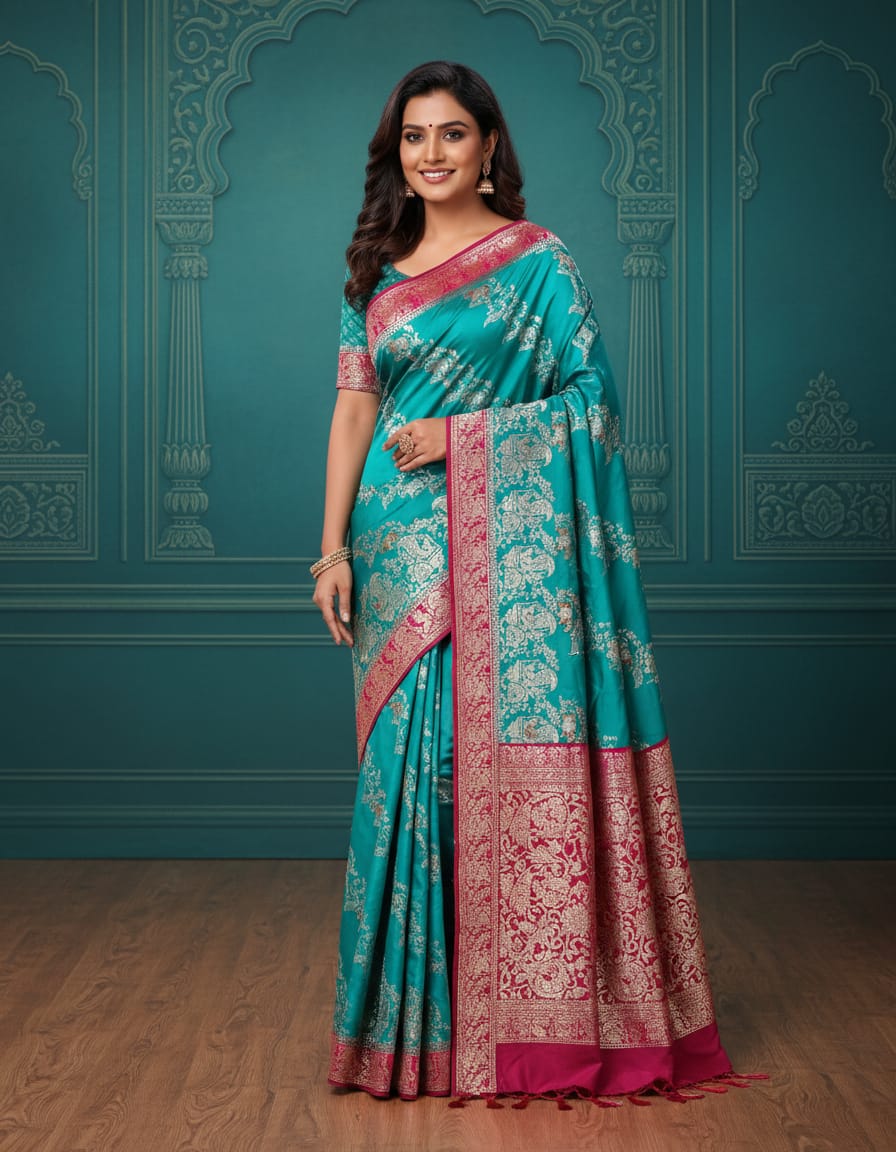 • Blouse Pattern: Solid Teal with Woven Zari Border on sleeves