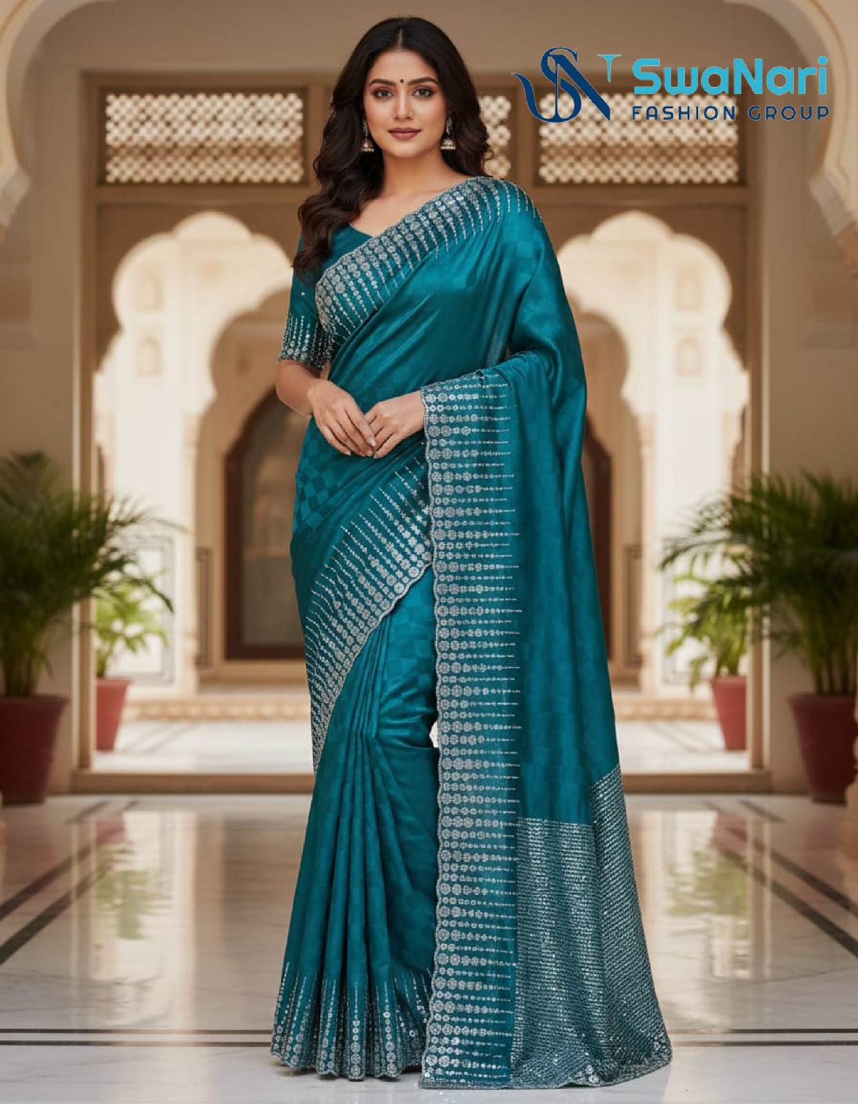 Regal Teal Sequin Border Satin Saree