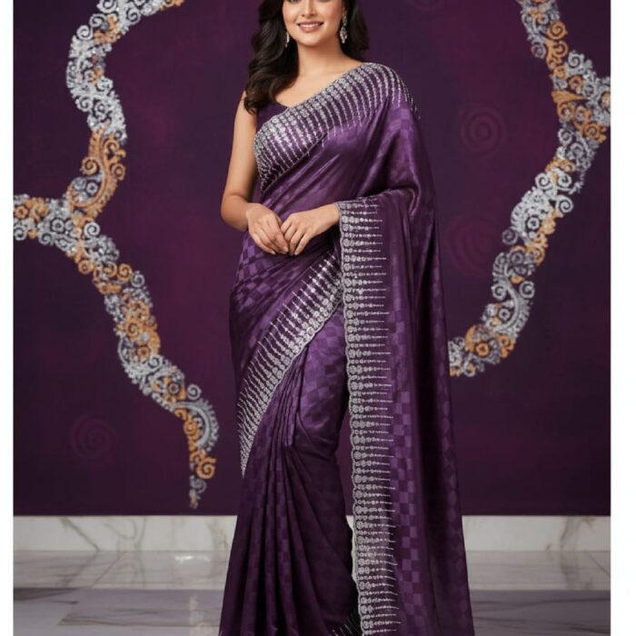 Exude modern opulence with this saree, crafted from a luxurious, high-sheen Satin or Faux Silk blend. The striking Peacock Teal hue is the perfect canvas for the intricate embellishment. The saree is defined by an exceptionally heavy and detailed border featuring striking silver-tone sequin and thread work arranged in beautiful horizontal bands along the edges and pallu. This contemporary masterpiece offers a sleek, glamorous drape and is an ideal choice for wedding receptions, cocktail parties, and formal evening events where sophisticated sparkle is desired.