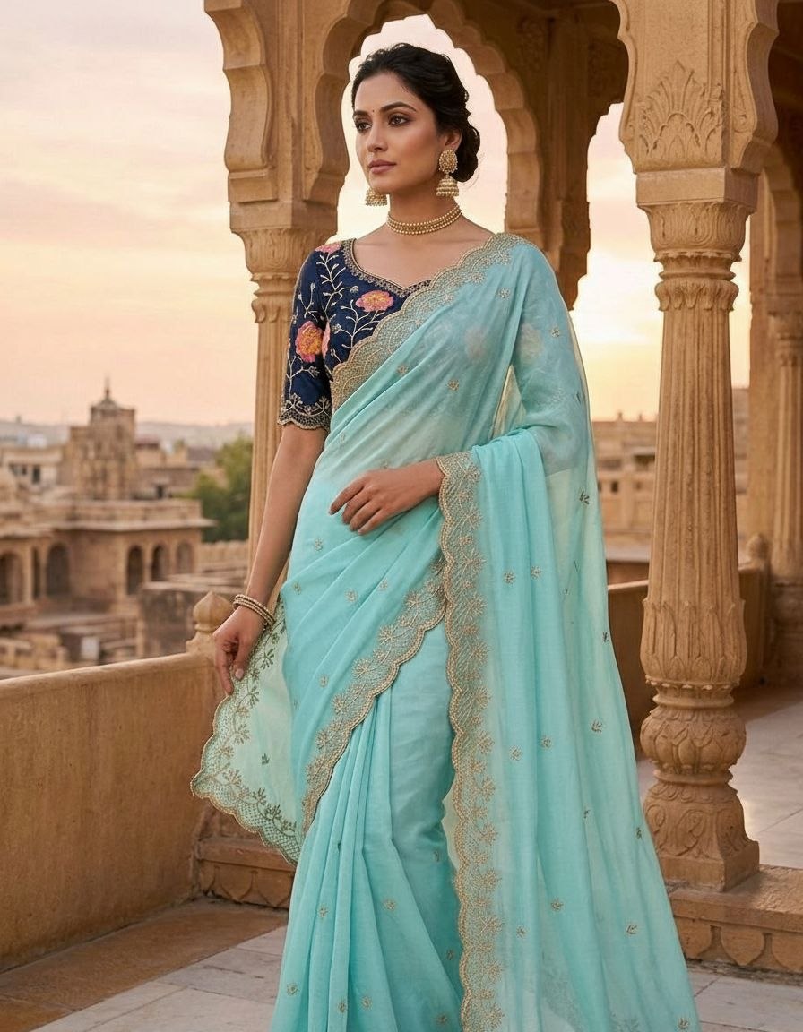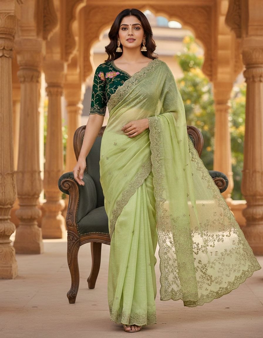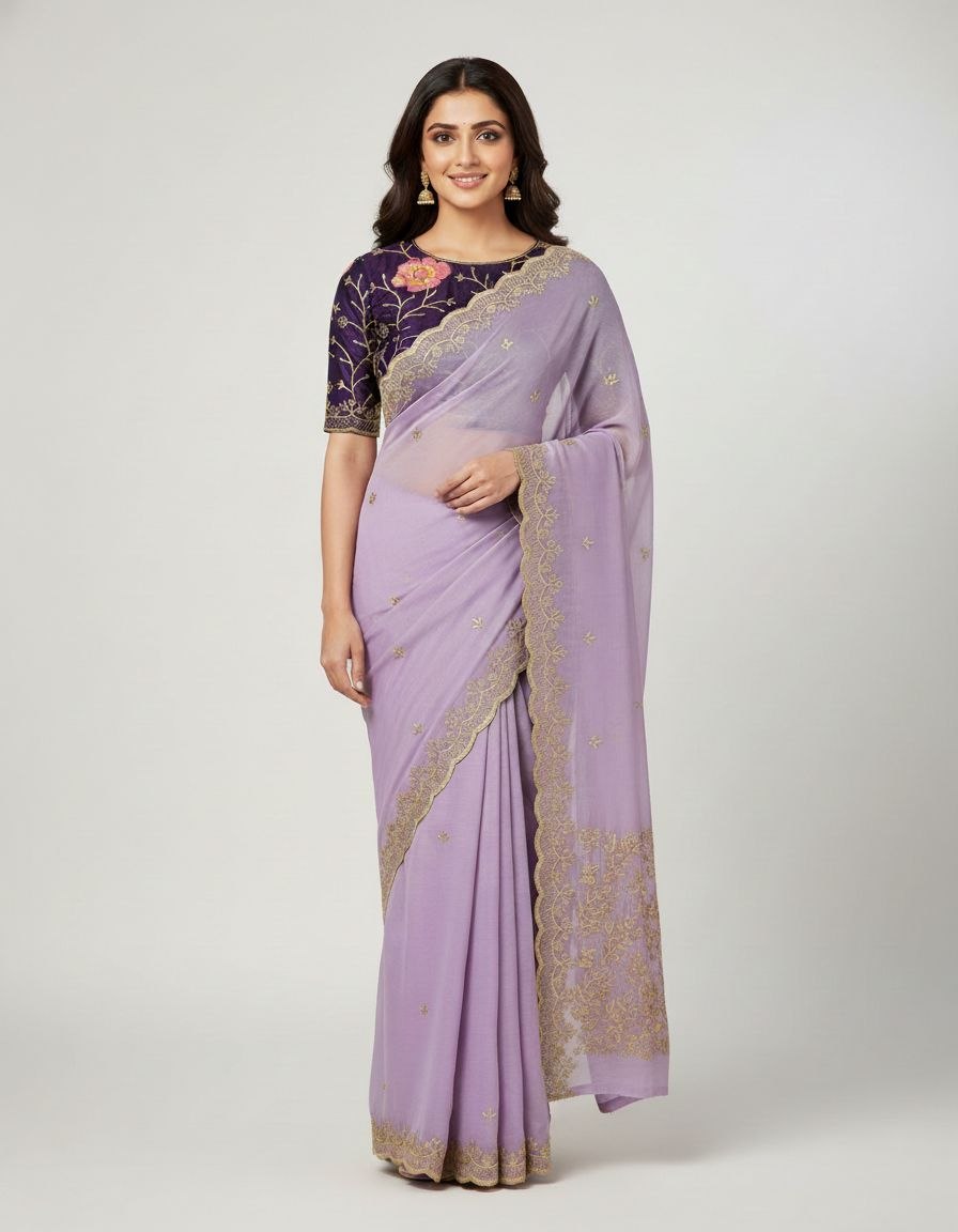Step into effortless elegance with this uniquely styled moss chiffon saree, crafted for women who appreciate subtle luxury with a modern twist. The lightweight moss chiffon fabric drapes beautifully, offering a soft, flowy silhouette that enhances your natural grace while ensuring all-day comfort. Its airy texture makes it an ideal choice for festive occasions, intimate gatherings, and sophisticated day events.The highlight of this saree lies in its exquisitely designed cpallu, adorned with fine detailing that adds depth and character without overpowering the overall look. The delicate craftsmanship on the pallu brings a refined charm, making it stand out while maintaining a minimal yet rich aesthetic. Subtle motifs scattered across the saree further elevate its elegance, giving it a balanced blend of tradition and contemporary design.Complementing the saree is a heavy contrast work blouse that truly defines its uniqueness. Designed to make a statement, the blouse features intricate patterns and bold detailing that create a striking contrast against the soft, muted tones of the saree. The rich design of the blouse adds a layer of sophistication and makes it versatile enough to be styled separately with other outfits as well.This ensemble is perfect for women who prefer understated glamour with a touch of artistic flair. Pair it with traditional jewelry for a classic look or opt for minimal accessories to let the outfit speak for itself. Whether you’re attending a festive celebration, a cultural event, or a formal gathering, this saree ensures you stand out with effortless style and confidence.Redefine your wardrobe with this stylish and contemporary moss chiffon saree—where comfort meets timeless elegance.