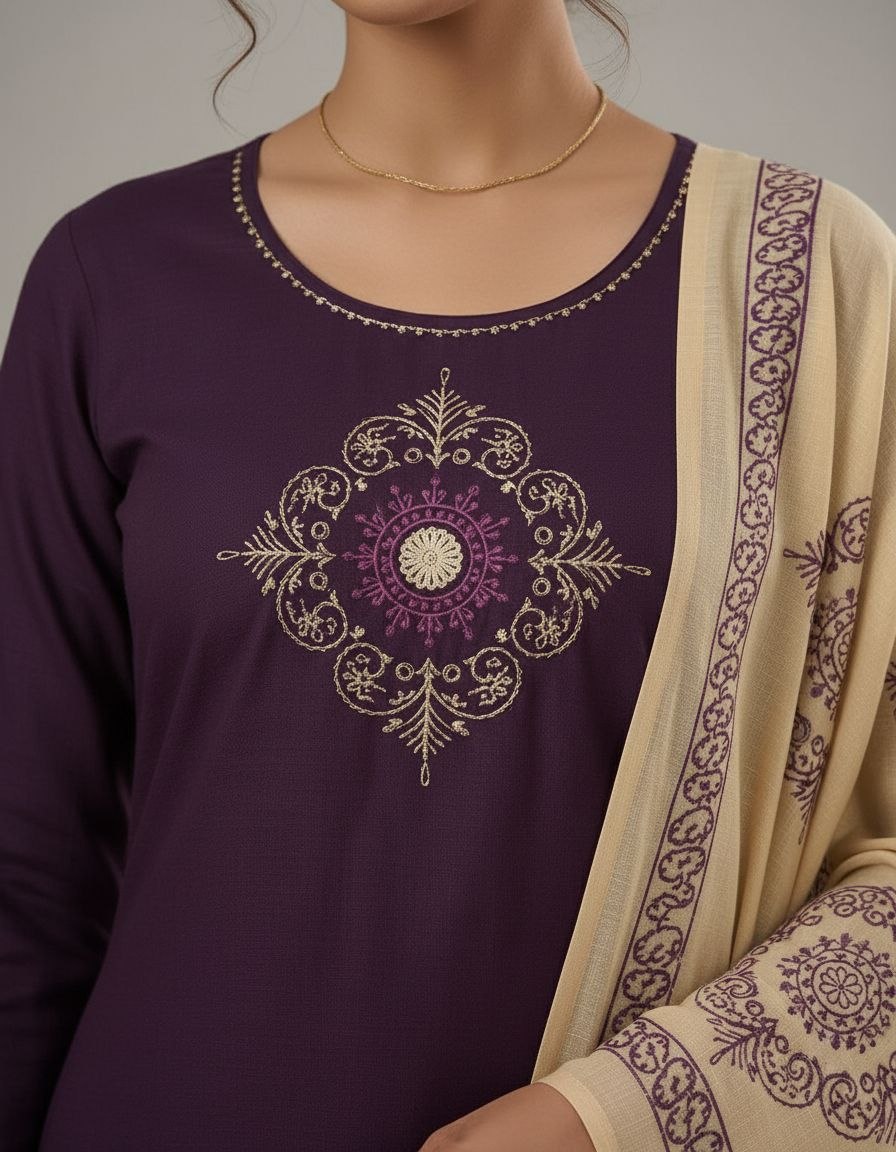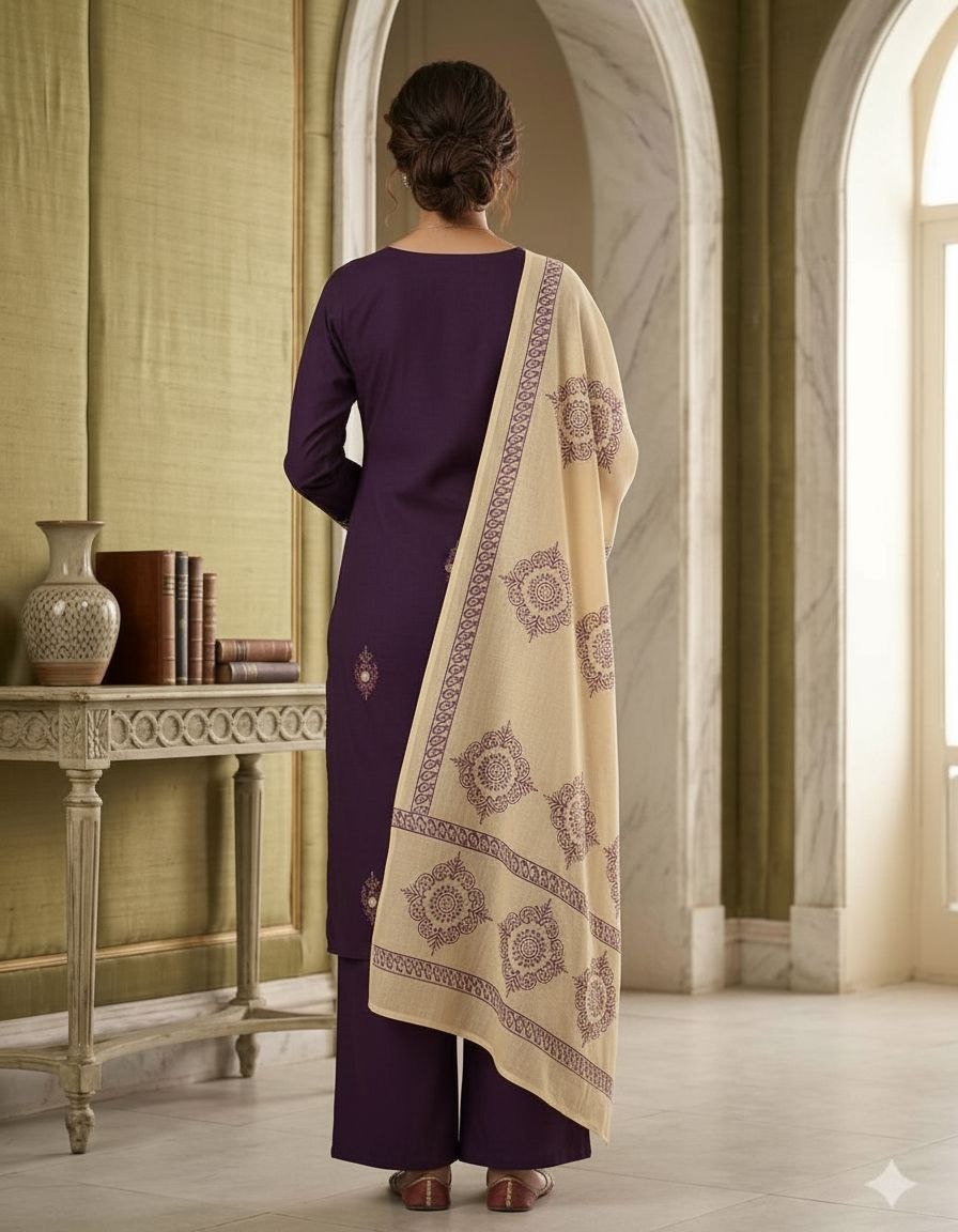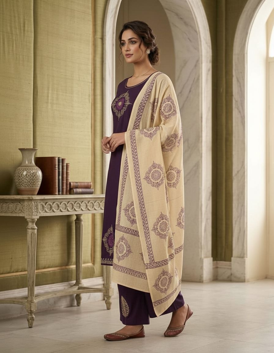 Experience the perfect blend of traditional craftsmanship and cool, contemporary styling with our Arctic Flora Collection. This two-piece ethnic ensemble is a masterclass in balanced aesthetics, featuring a delicate all-over botanical print of sprawling vines and floral motifs. Presented in a serene, ice-blue palette, this set is designed for the woman who values a refreshed, “breezy” look for her professional and social wardrobe.