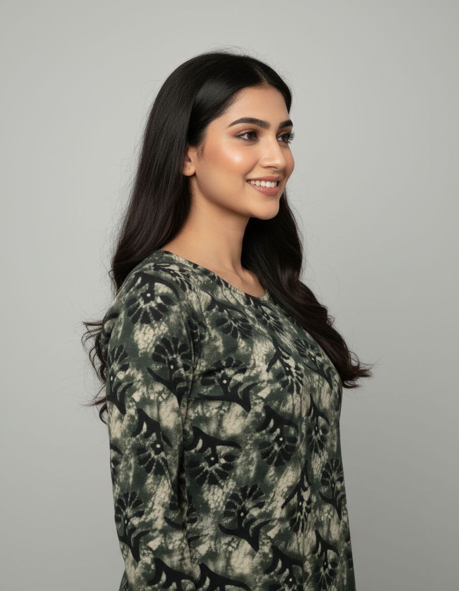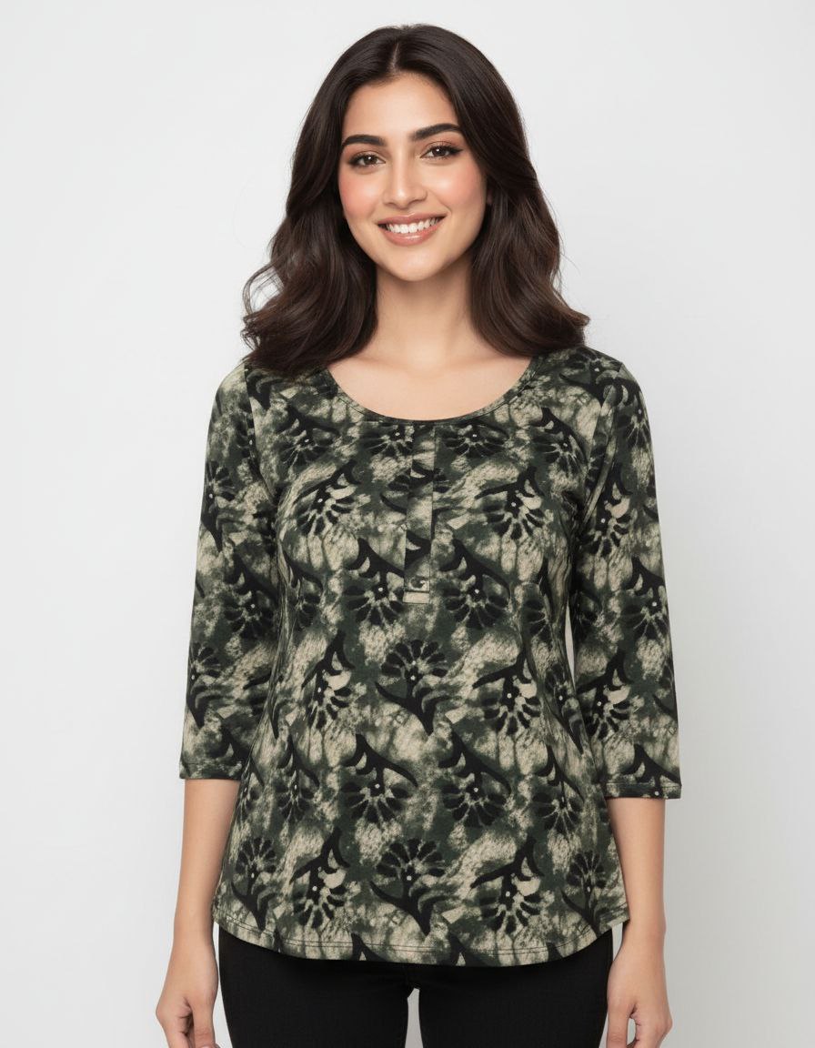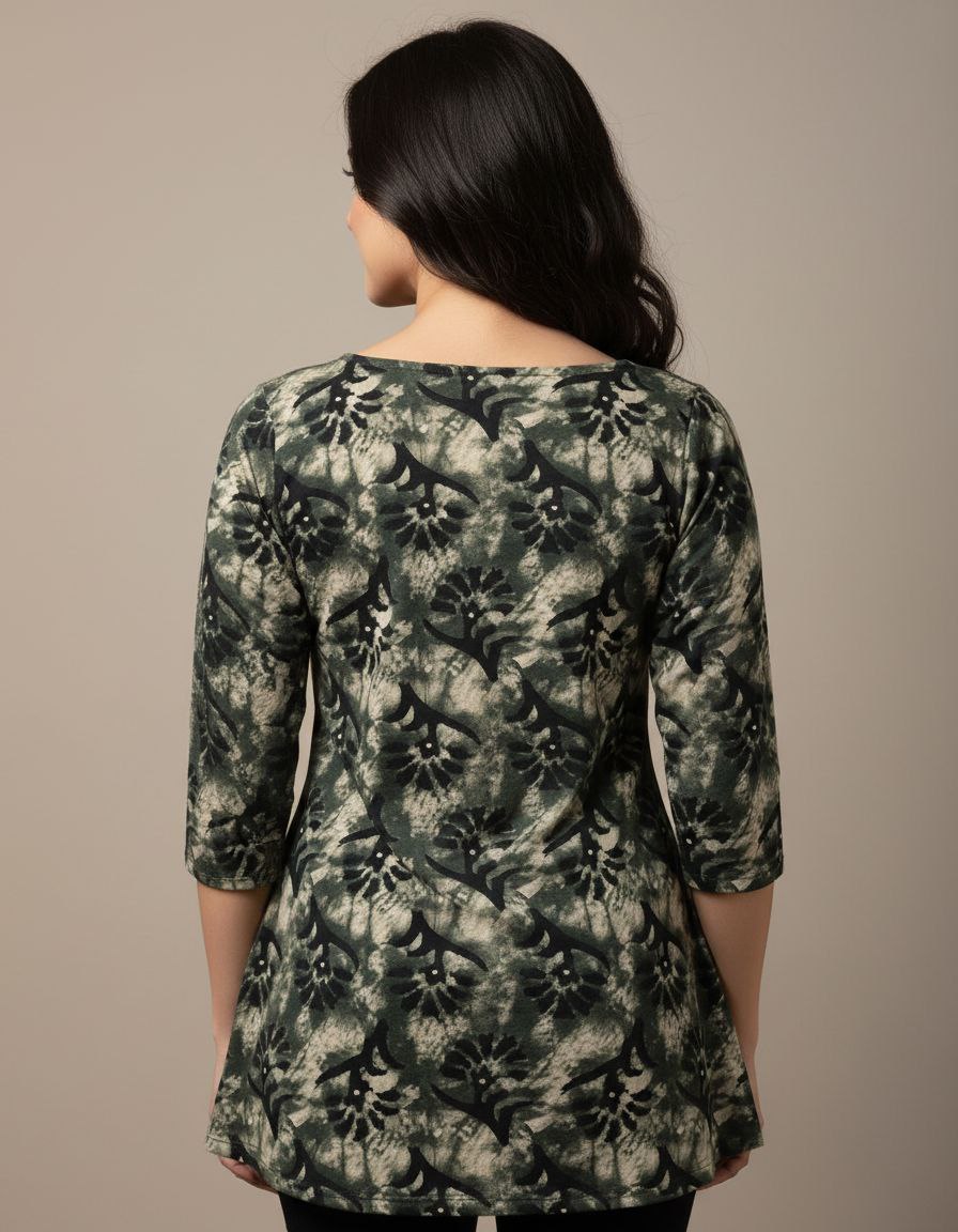 Elevate your casual wardrobe with this sophisticated hip-length tunic, featuring a traditional batik-inspired aesthetic. The garment is crafted from a comfortable fabric showcasing a distressed grey and charcoal marbled base, layered with a striking black floral block-print pattern. It is designed with a modest round neckline and a partial button-down front for a clean, tailored finish. The three-quarter length sleeves include tab-button detailing, allowing for a versatile, rolled-up look. This piece offers a perfect blend of artisanal charm and modern style, ideal for daily wear.