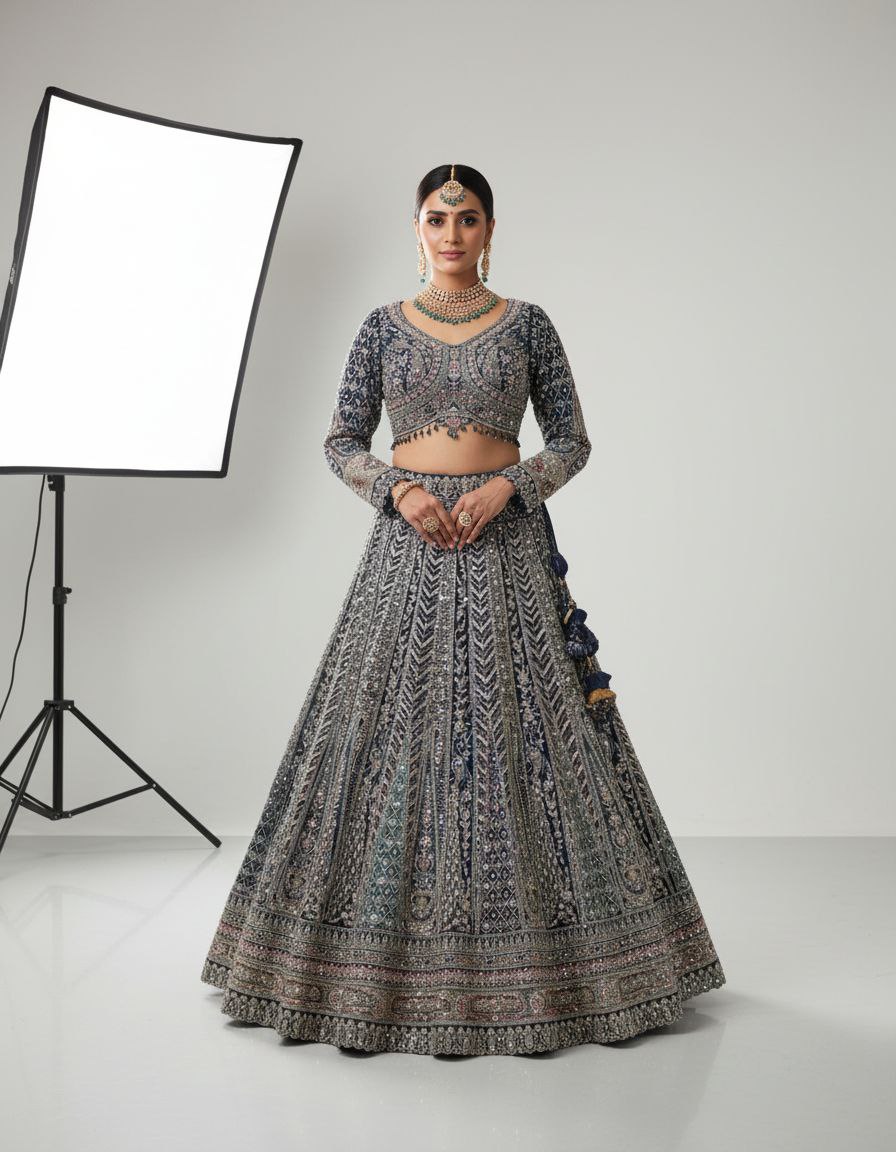 | Work | Heavy Silver/White Thread and Bead work on the choli. All-over dense sequin/shimmer on the lehenga. |
