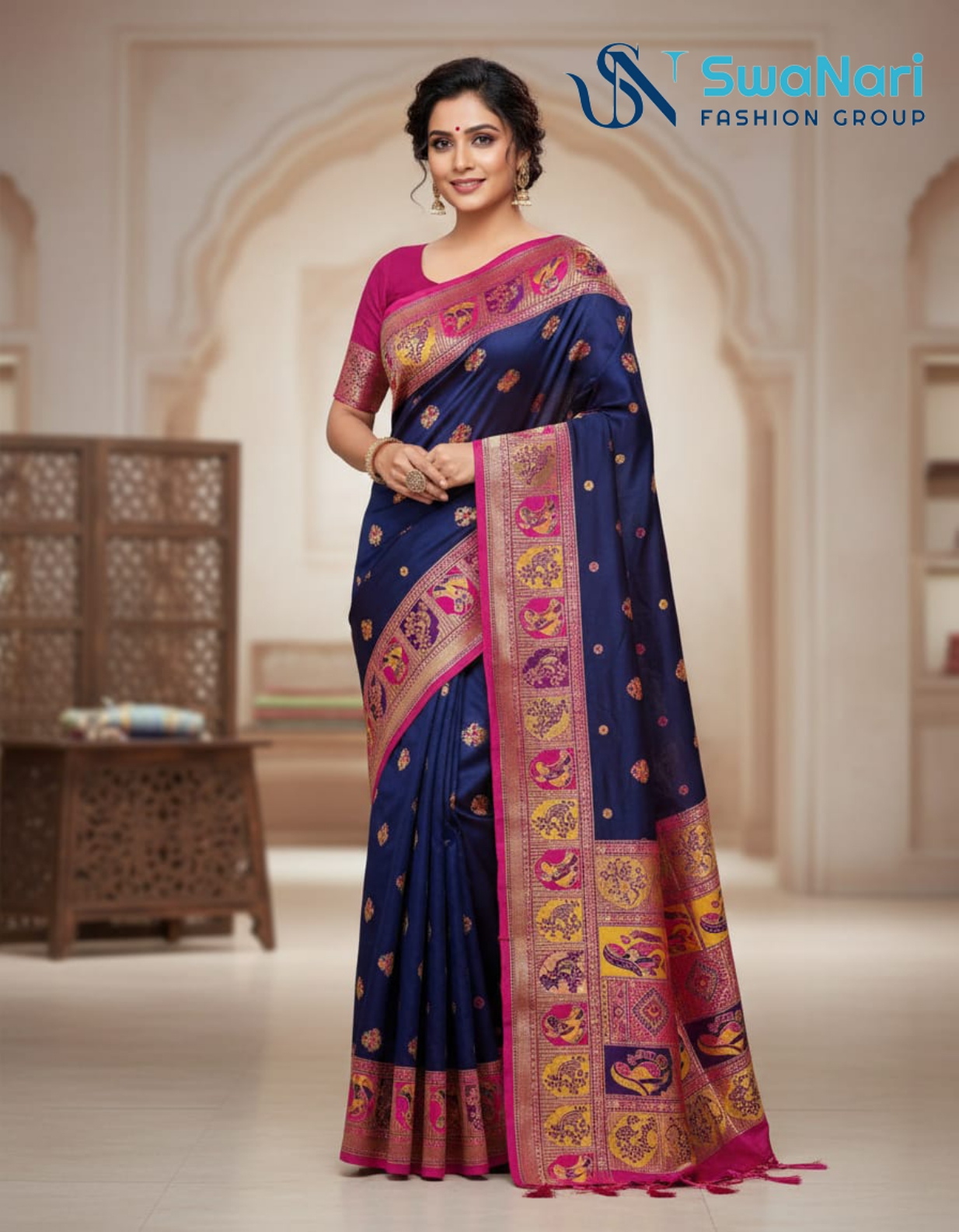 Make a striking statement with this sophisticated Kajari style saree from the SwaNari Fashion Group. Crafted from a rich Art Silk or Silk Blend fabric, this saree features a deep Black base. The body is defined by a bold, horizontal woven Zari stripe pattern in antique gold, creating a dynamic, shimmering effect. The saree is framed by a heavy, contrasting gold zari border and pallu with intricate woven detailing. This elegant piece is ideal for evening functions, festive celebrations, and formal gatherings where a blend of traditional weaving and bold color is desired.