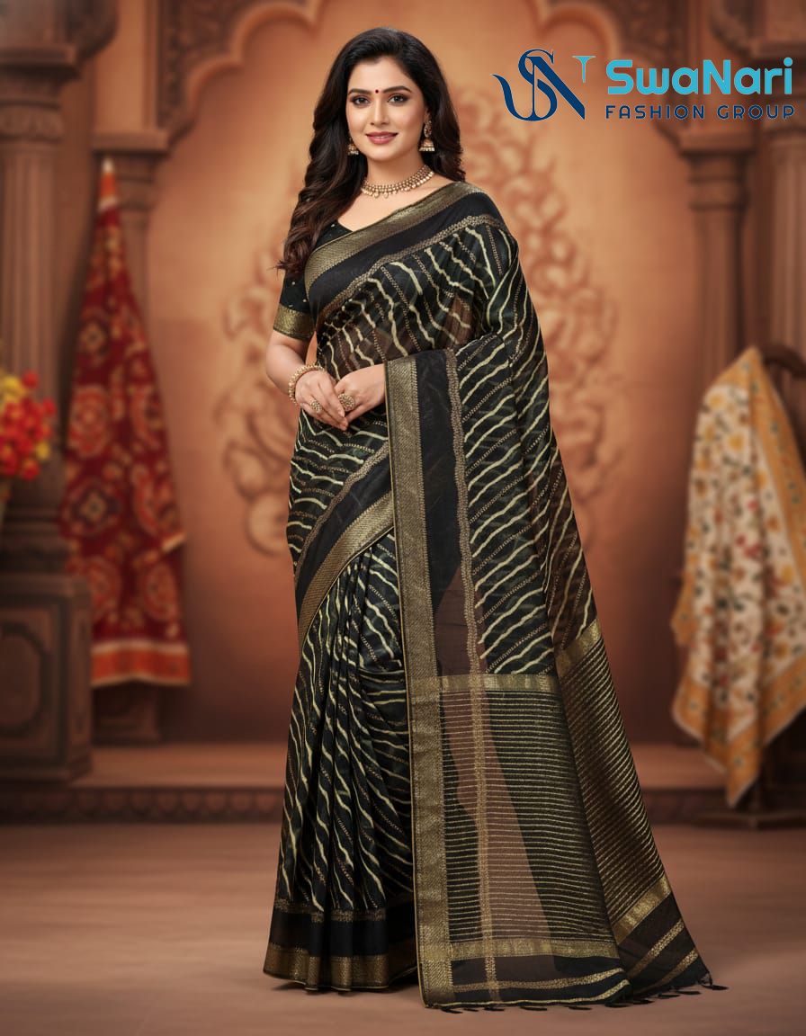 Make a striking, sophisticated statement with this unique saree, crafted from a Silk or Art Silk Blend. The deep Jet Black base is illuminated by a stunning woven or printed design featuring horizontal gold-toned stripe/wave patterns (similar to Leheriya or Kajari motifs). The design is completed by a detailed black and gold woven border and pallu, offering a rich texture and traditional contrast. This elegant piece is ideal for evening functions, festive gatherings, and sophisticated semi-formal events where traditional patterns are interpreted with modern flair.