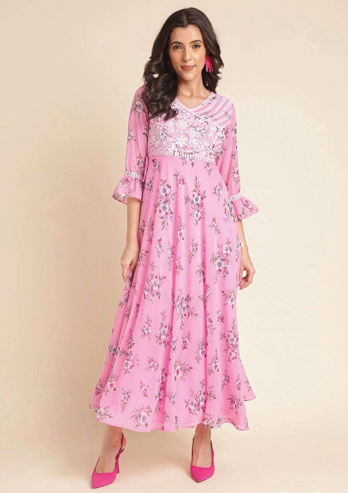 Radiate feminine charm with this stunning floor-length maxi dress in a soft blush pink. The garment features an all-over romantic floral print in shades of lavender and deep rose, set against a lightweight, flowing fabric that offers a graceful silhouette. The bodice is elevated by a sophisticated white lace-style embroidery on the yoke, creating a beautiful textural contrast. Designed with a flattering V-neckline and three-quarter length sleeves finished with playful ruffled cuffs, this dress perfectly balances bohemian whimsy with modern elegance. Ideal for garden parties, brunch dates, or festive daytime gatherings, it provides effortless style and all-day comfort.