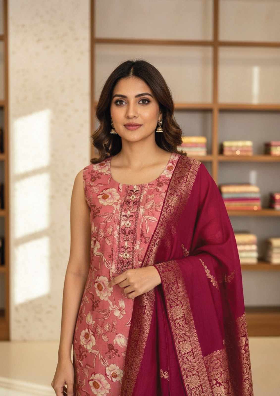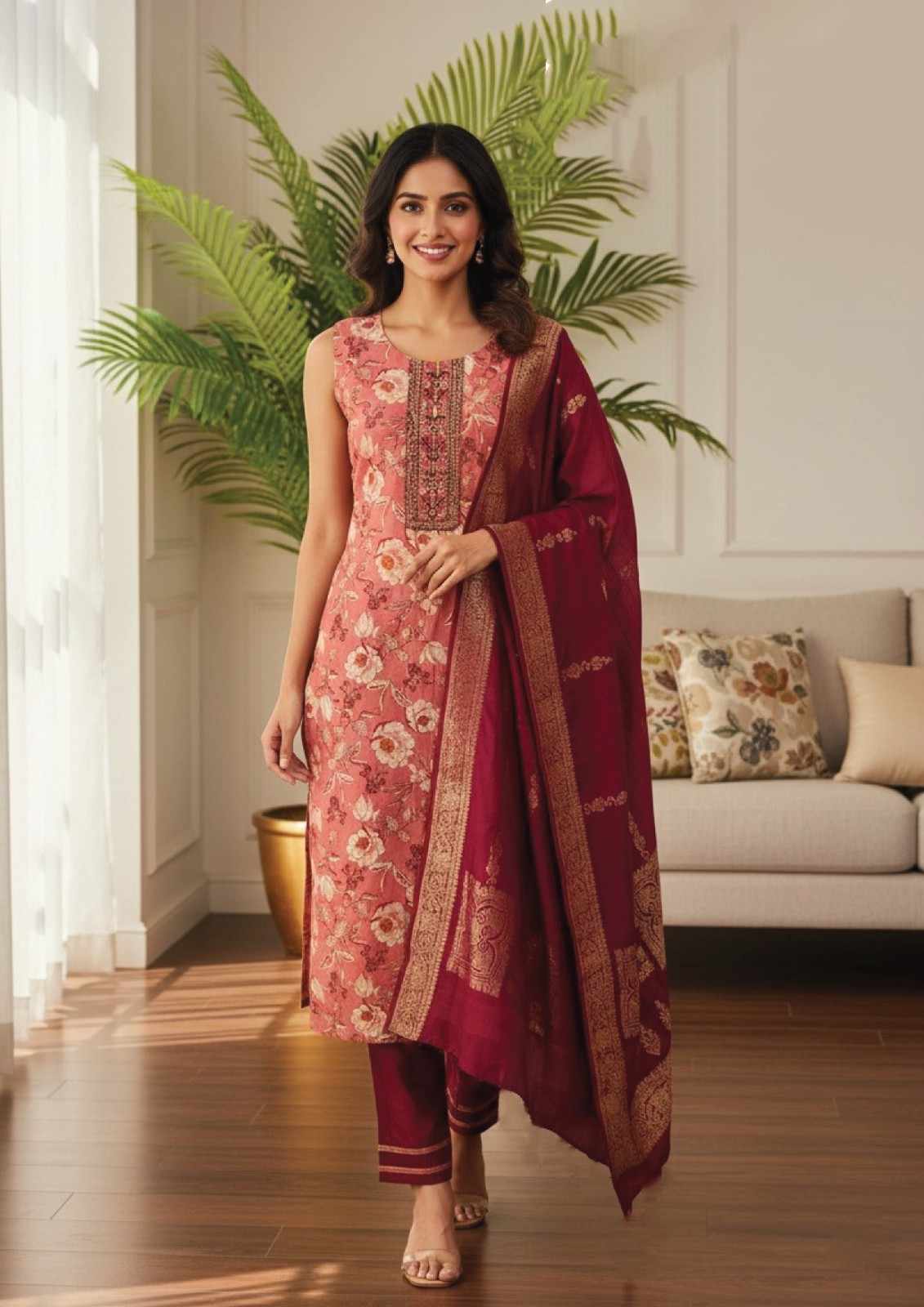 Exude timeless grace in this sophisticated three-piece ethnic ensemble, perfect for festive occasions and elegant gatherings. The sleeveless, straight-cut kurta features a soft blush rose hue adorned with a delicate all-over vintage floral print. A central embroidered panel with intricate threadwork adds a luxurious focal point to the round neckline. Complementing the kurta is a rich, deep berry-toned dupatta crafted from a premium translucent fabric, featuring a broad, shimmering gold zari border with ornate floral patterns. This set beautifully harmonizes feminine pastel tones with bold traditional accents for a truly refined look.