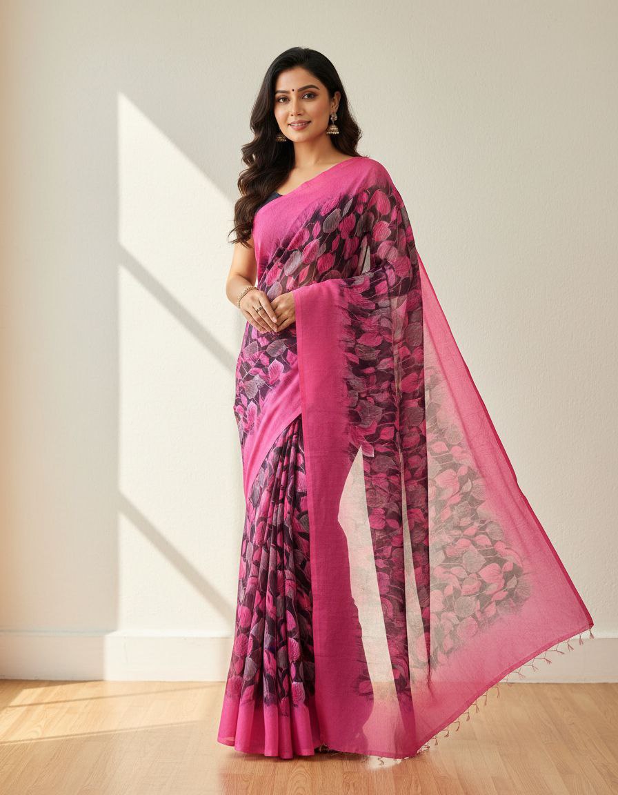 This striking saree features a vibrant, eye-catching fuchsia or rani pink color, likely in a lightweight fabric like linen or cotton silk. The body of the saree is dominated by a bold abstract leaf or botanical print in contrasting shades of black and deep purple/grey, creating a dynamic effect. The pallu and border are finished with a solid, matching fuchsia pink band, lending structure and emphasizing the main color. It is paired with a matching solid pink blouse (implied) to maintain focus on the saree’s vivid print. This contemporary design is perfect for social gatherings, festive events, or daytime occasions where a pop of color is desired.