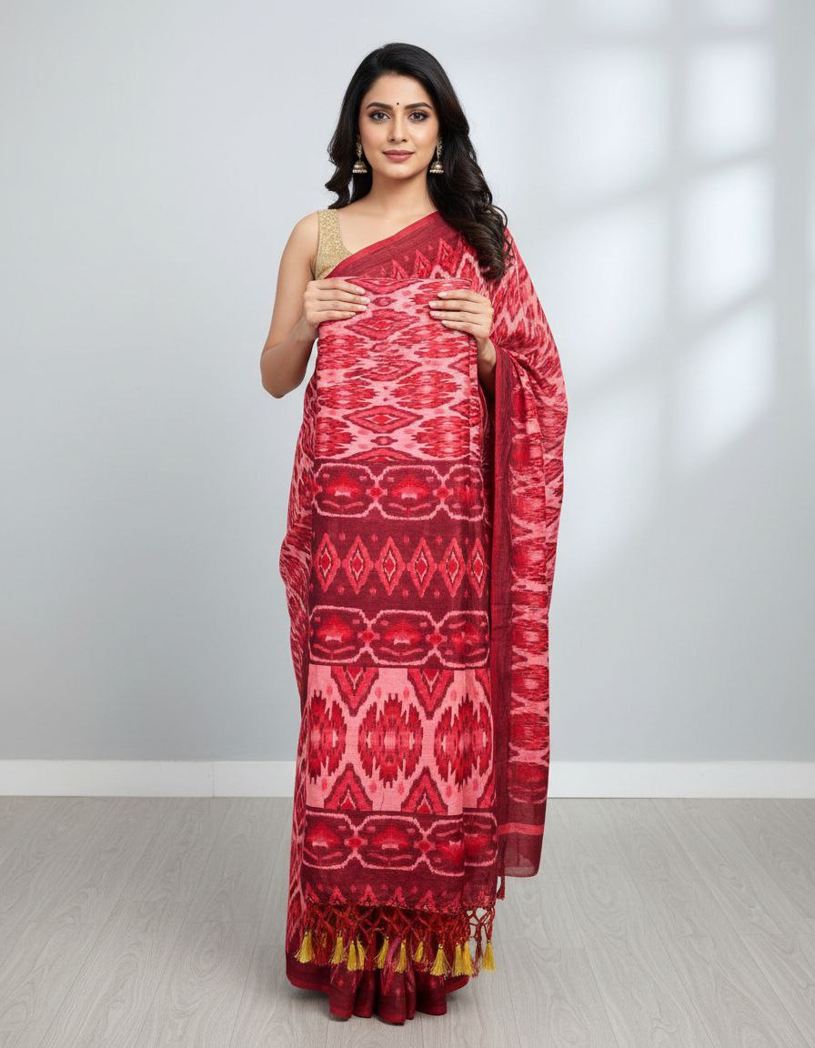 This captivating saree is a celebration of vibrant colors and traditional craft, featuring a dynamic Ikat weave in shades of deep maroon, bright red, and soft pink. The pattern is geometric, with prominent diamond and zig-zag motifs running across the body and pallu, typical of an authentic handloom design. The fabric appears to be a textured silk or cotton-silk blend, giving it a structured yet flowy drape. The pallu is finished with playful yellow tassels, adding a folk touch. It is paired with a contrasting solid gold sleeveless blouse, creating a festive and bold look. This is a perfect choice for festivals, cultural events, and celebrations.