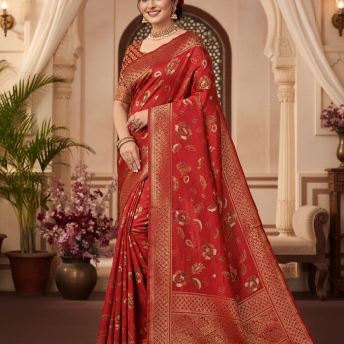 Make a striking, traditional statement with this exquisite saree woven from a luxurious Art Silk/Blended Silk. The vibrant Classic Red hue, synonymous with Indian festivities, is richly adorned with intricate, all-over gold woven floral motifs. The look is perfected by an exceptionally broad and heavy antique gold zari border and pallu, showcasing fine traditional weaving and providing a structured, magnificent drape. This regal piece is the quintessential choice for weddings, grand festivals (like Diwali/Karva Chauth), and formal traditional ceremonies, offering timeless beauty and opulence.