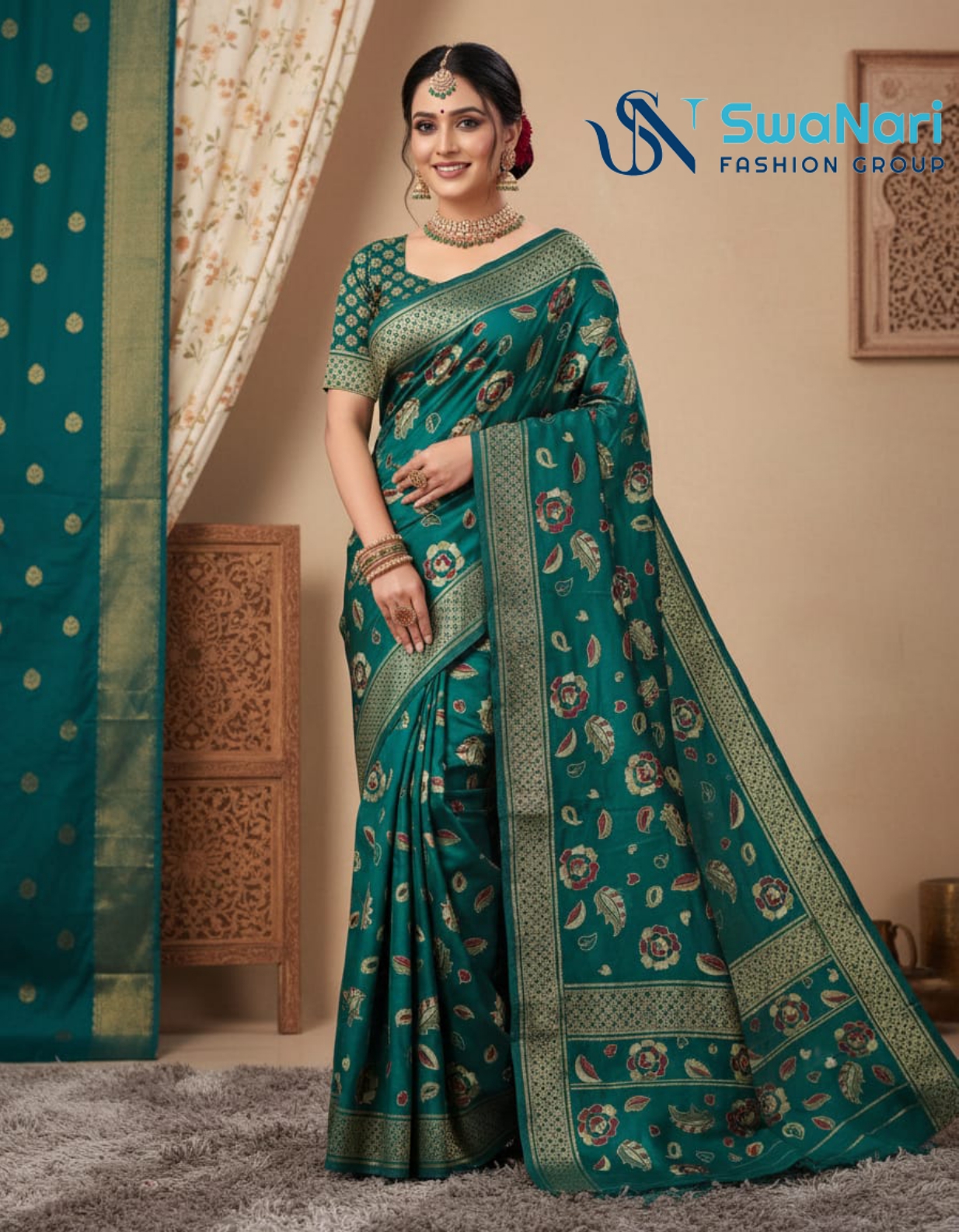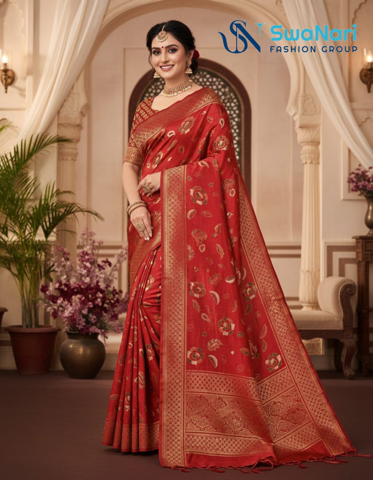 Make a striking, traditional statement with this exquisite saree woven from a luxurious Art Silk/Blended Silk. The vibrant Classic Red hue, synonymous with Indian festivities, is richly adorned with intricate, all-over gold woven floral motifs. The look is perfected by an exceptionally broad and heavy antique gold zari border and pallu, showcasing fine traditional weaving and providing a structured, magnificent drape. This regal piece is the quintessential choice for weddings, grand festivals (like Diwali/Karva Chauth), and formal traditional ceremonies, offering timeless beauty and opulence.