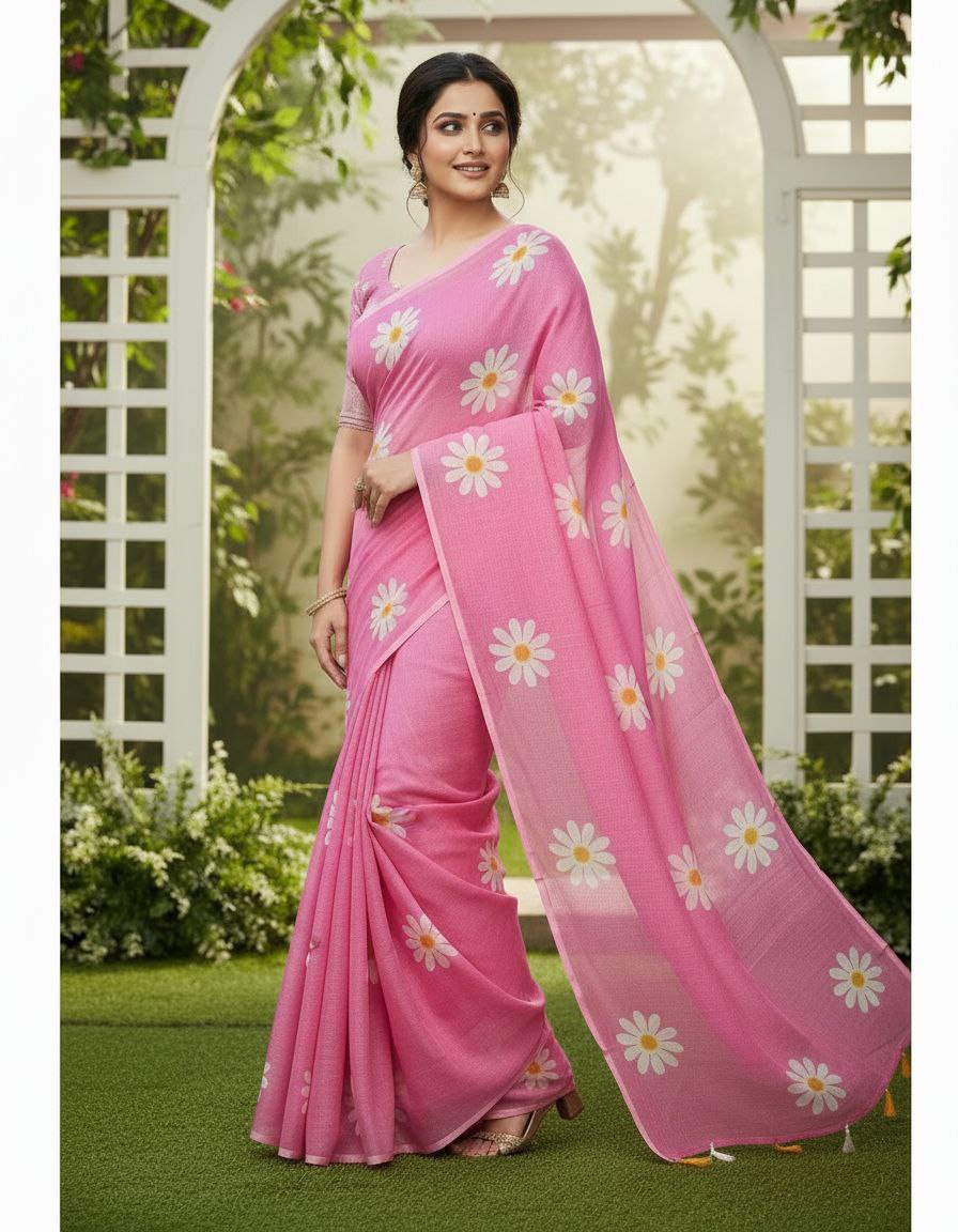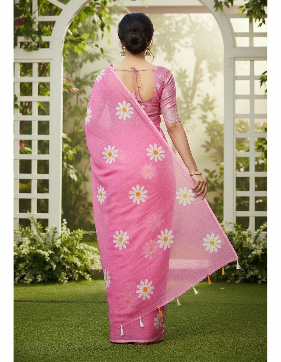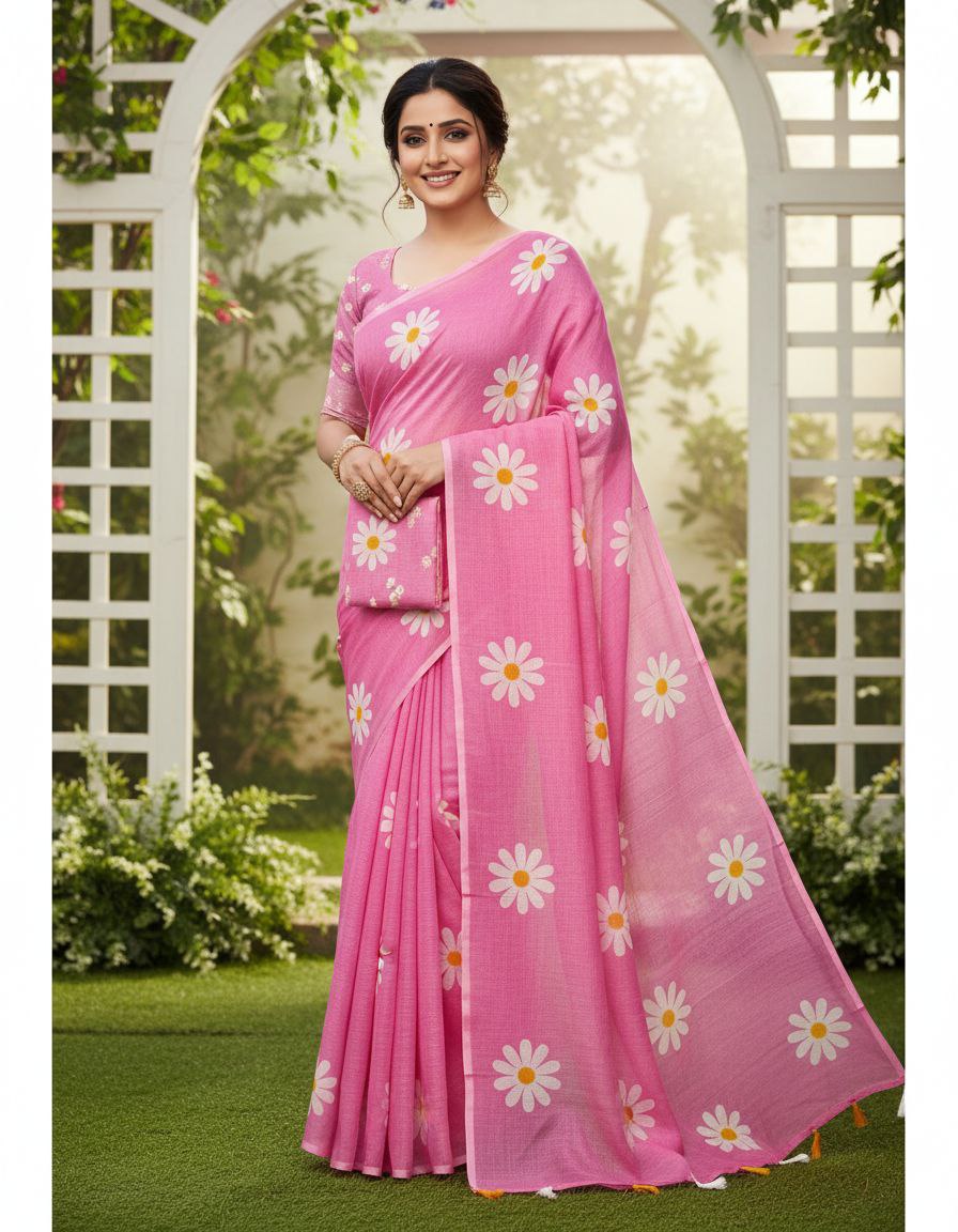 Candy Pink Cotton Silk Saree with White Daisy Floral Print