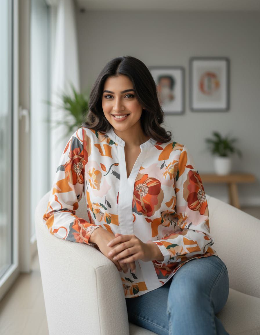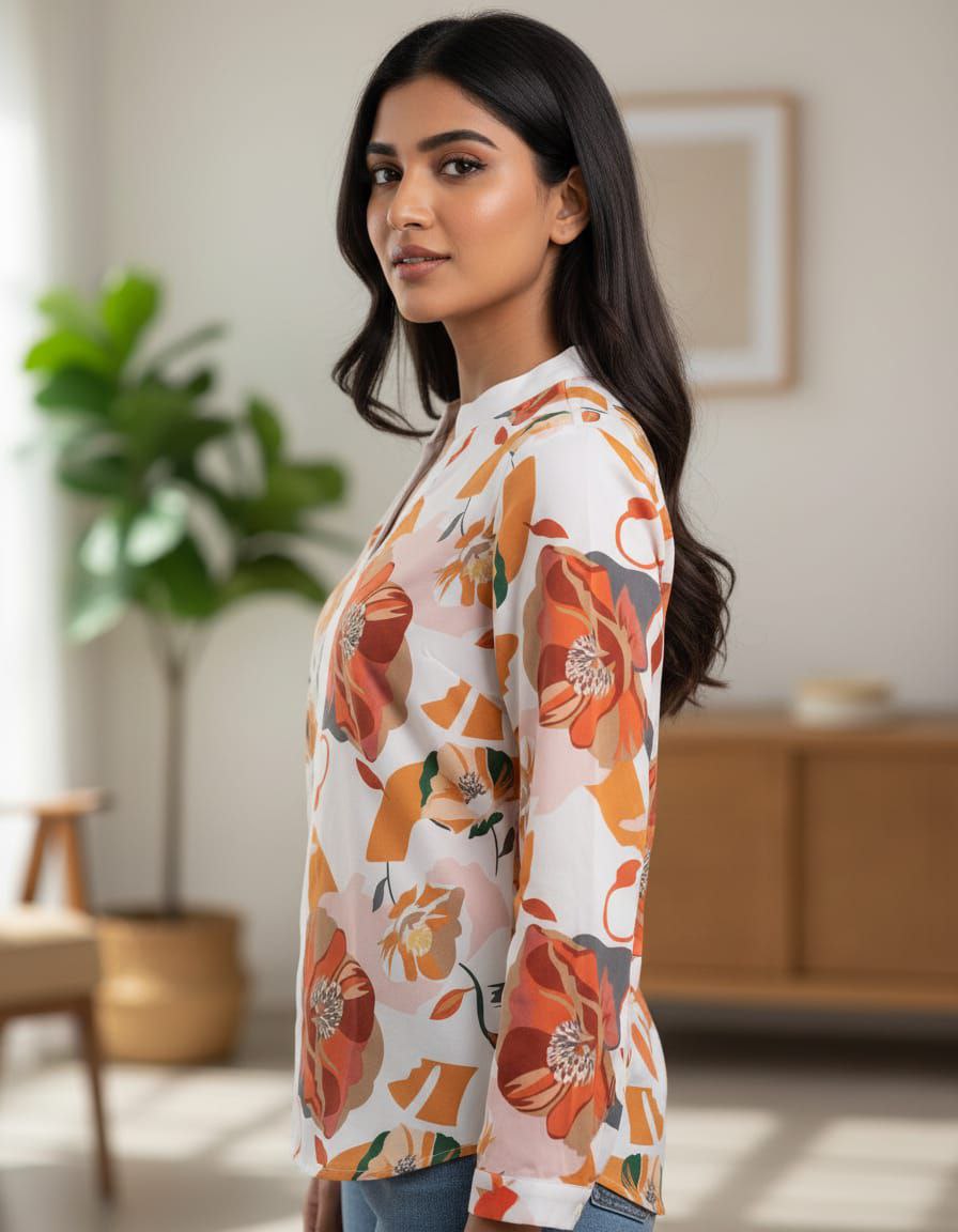 This elegant blouse features a vibrant, multi-colored floral and abstract print on a crisp white background, perfect for adding a touch of sophisticated color to your wardrobe. The design includes a V-neckline created by a central white placket, offering a clean and polished look. Long sleeves finish with wide white cuffs, complementing the neckline. The woman is wearing it tucked into white trousers and accessorizing with a brown leather clutch and belt, making it an ideal choice for the office or a business casual setting.