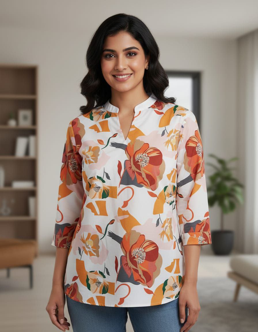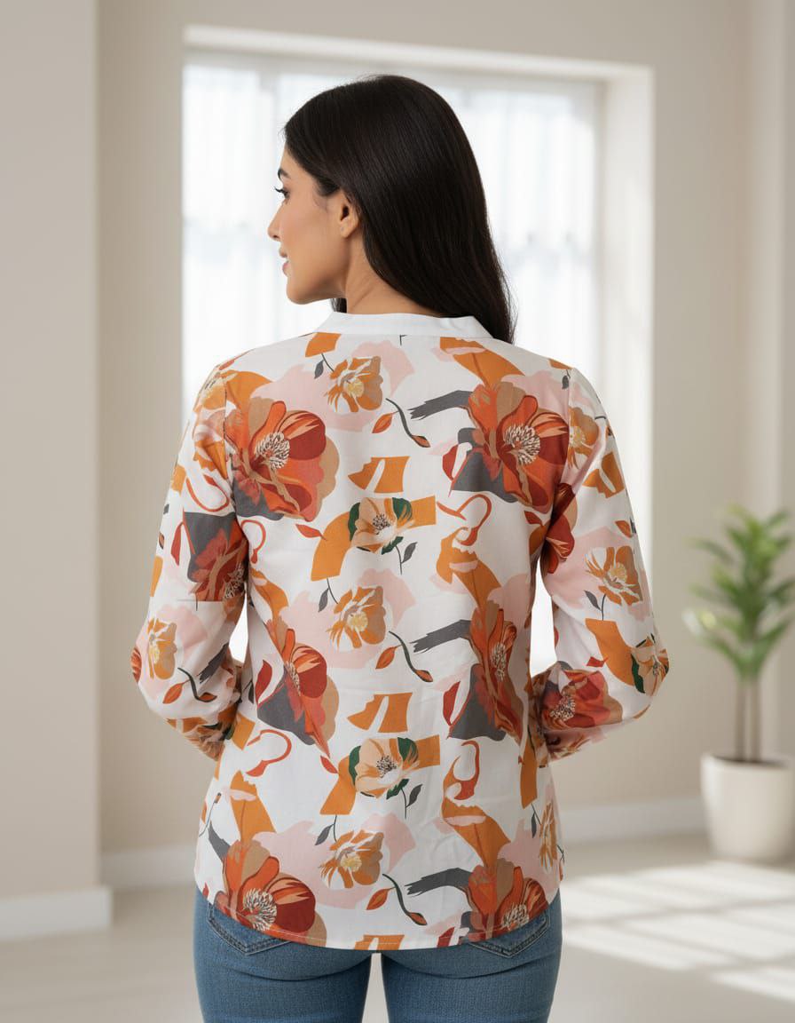 Material: Based on the drape and sheen, it is likely a lightweight, flowy synthetic fabric such as polyester or a polyester blend, which is typical for printed blouses.