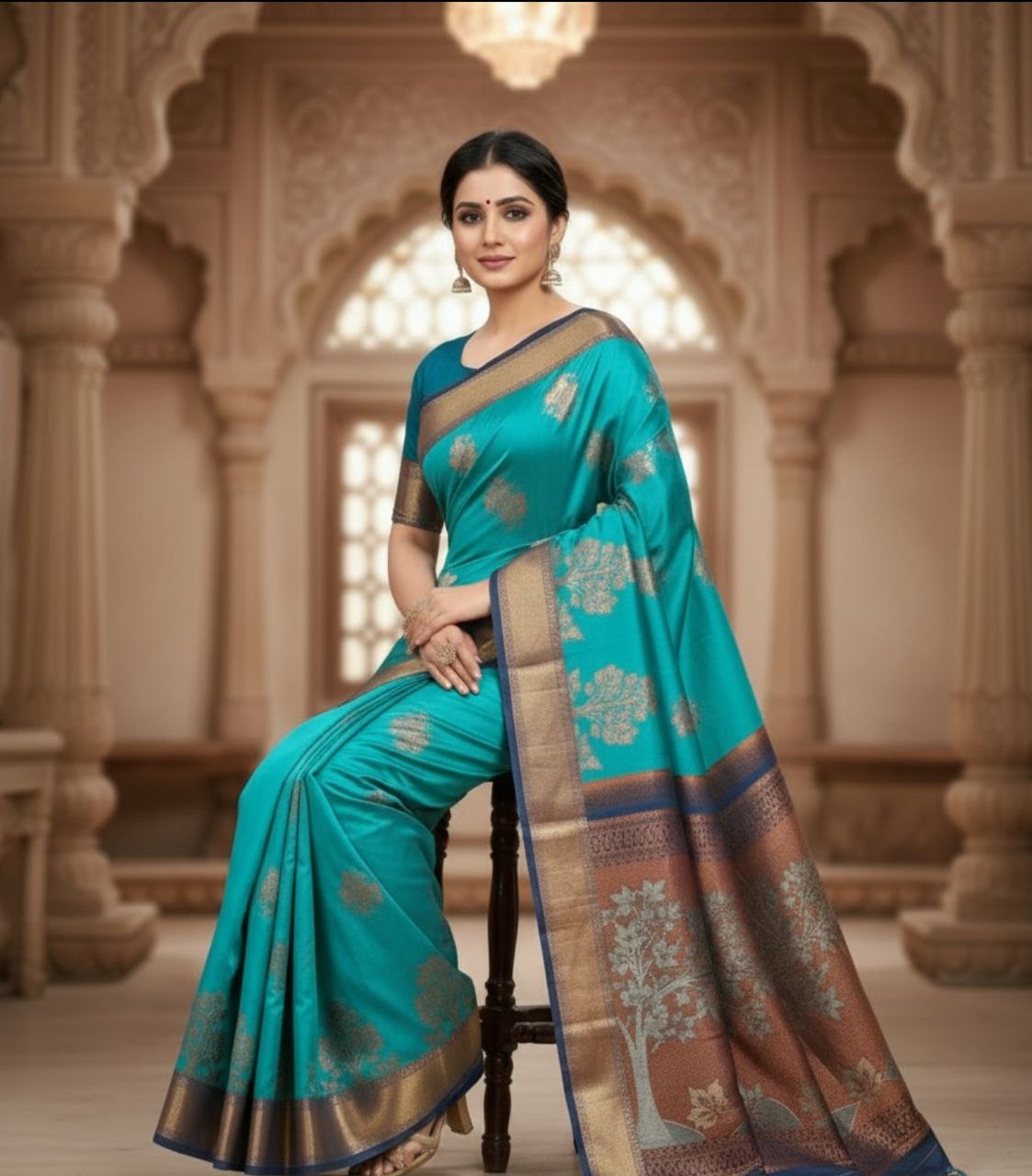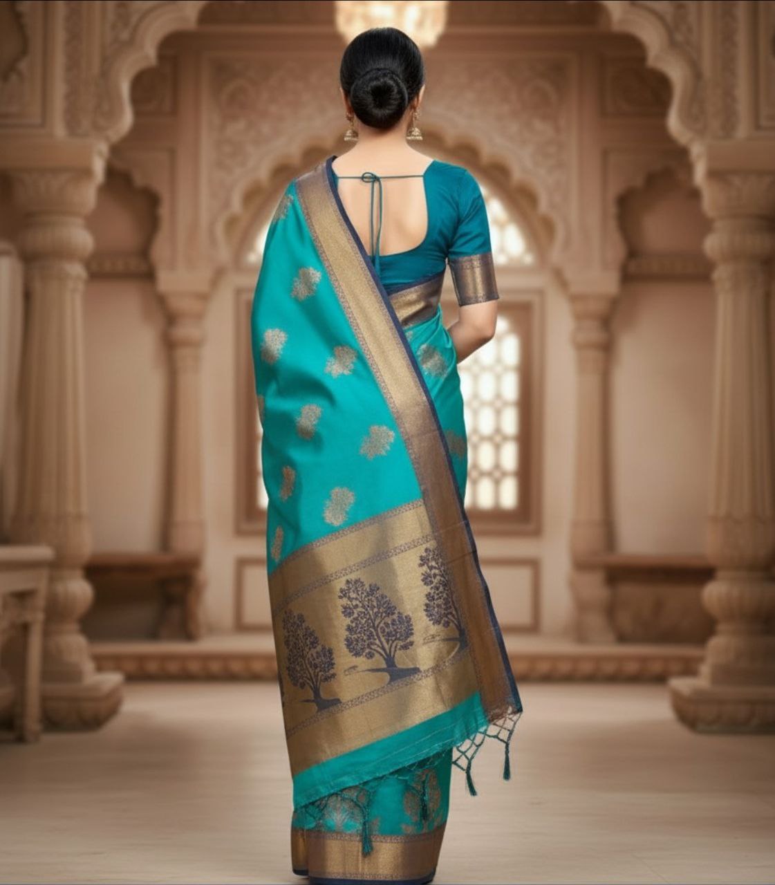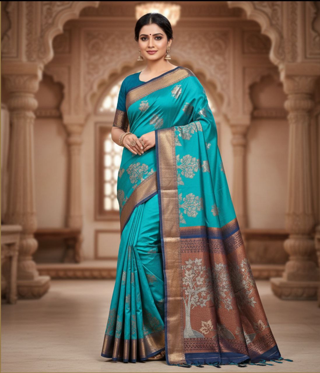 The saree is anchored by a majestic, multi-toned border featuring a deep copper-bronze base adorned with larger, more detailed tree patterns. A striking navy blue piping runs along the edges, providing a sharp, modern definition to the traditional weave. The pallu is a grand extension of this artistry, showcasing dense Zari work that transitions into elegant hand-knotted tassels. Paired with a deep teal blouse featuring matching Zari borders, this ensemble is designed for the woman who seeks to make a powerful yet graceful statement. Perfect for high-end weddings, festive galas, or cultural celebrations, it is a timeless addition to any luxury trousseau.